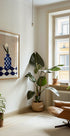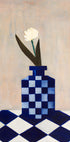 Moderni asetelma, jossa on erottuva sininen ruudullinen maljakko ja yksi herkkä kukka. Geometristen kuvioiden ja minimalismin yhdistelmä tuo eleganssia ja taiteellista charmia moderniin sisustukseen.