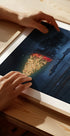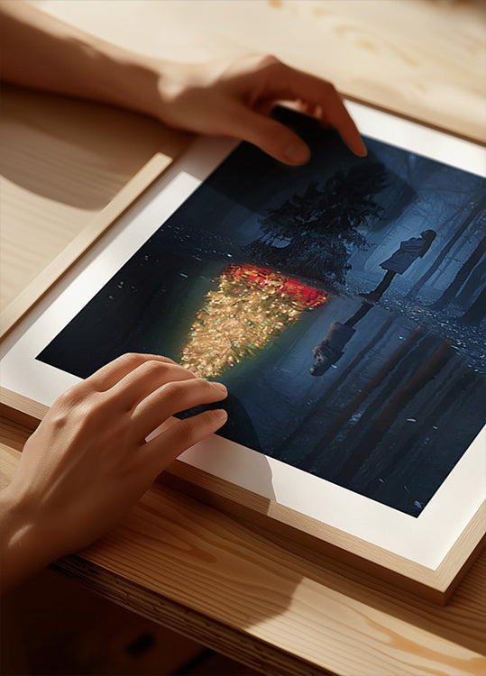 Hiljainen talviyö syvänsinisin sävyin: Luminen metsä, peilimäinen metsäjärvi ja loistava joulukuusi, jonka valo heijastuu vedestä. Rannalla tyttö seisoo mietteliäänä tyynenä. Terry F:n Hope of Christmas vangitsee taikuuden, toivon ja kodikkaan rauhallisuuden, joka seuraa joulun tähtikirkasta. Täydellinen tuomaan lämpöä ja unenomaisuutta talven pimeyteen.