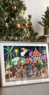 Tre vise mænd rider gennem natten mod Betlehem, guidet af julestjernen, mens en lysende engel svæver over byens kupler og palmer. Caroline Bonne Müller forener eventyrlig folkekunst med varme farver, detaljer og stemning – en poetisk julescene med kameler, gaver og glimtende stjerner. En hyldest til julens fortælling for både børn og voksne.
