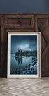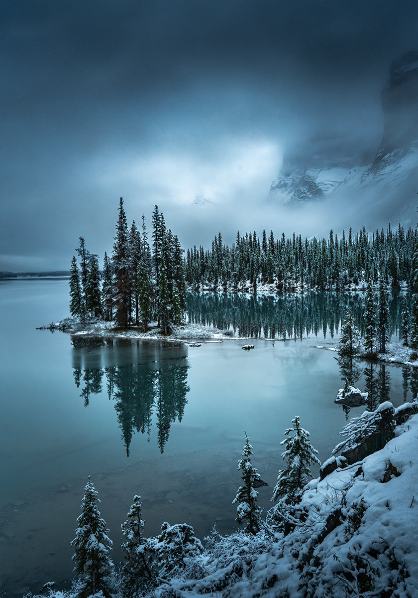 Taiteilija Bing Li aamunkoittoinen talvimaisema: sumu ajelehti peilimäisen, jään reunustaman järven yli, jossa kuusien ja lumihuippuisten vuorten siluetit heijastuvat. Viileä taivas vaihtuu syvän sinisestä pehmeäksi vaaleanpunaiseksi. Rauhallinen, runollinen kohtaus, joka kutsuu mietiskelemään ja hiljaiseen pohdiskeluun. Täydellinen talvitunnelmaan.