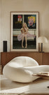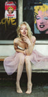 Moderni tulkinta klassisesta poptaiteesta, jossa yhdistyvät ikoniset aiheet nykyaikaiseen tyyliin. Vaaleanpunaisessa hameessa pukeutunut nainen heijastaa vintage-glamouria Warholin Marilynin ja Campbellin keittograffitien taustalla, mikä luo dynaamisen visuaalisen fuusion.