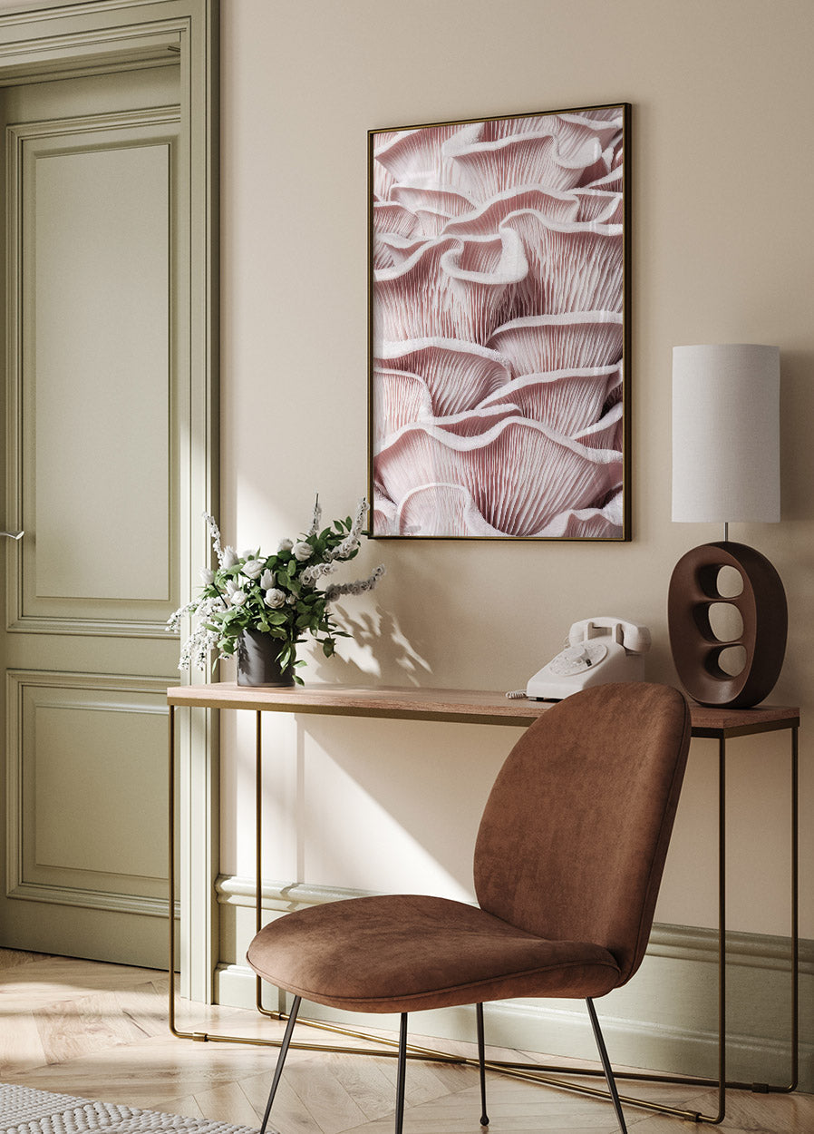 Vaaleanpunainen osterivinokkaalla ja makrolla Juliste