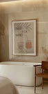 Tämä rauhoittava kuvitus herättää trooppisen läsnäolon hiljaisen hetken. Sytytetty tuoksukynttilä, jossa on eteerisiä öljyjä (appelsiini, minttu ja eukalyptus), seisoo virkistävän mehulasillisen vieressä palmunlehtien pehmeissä varjoissa. Sanat "Free Your Mind" vaativat taukoa ja rauhaa. Mykistettyjen värien ja minimalistisen kesäisen tunnelman ansiosta juliste huokuu kylpylämäistä rauhallisuutta – ihanteellinen tiloihin, jotka etsivät rauhaa, keskittymistä ja luonnollista tasapainoa.