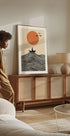 Minimalistinen kuva yksinäisestä hahmosta pienessä veneessä kellumassa aaltoilevilla mustilla aalloilla jyrkän oranssin auringon alla. Puhtaat linjat ja lämpimät sävyt luovat rauhallisen, harkitsevan tunnelman – ihanteellinen kappale moderneihin tiloihin, joissa on rauhallista ja yksinkertaista.
