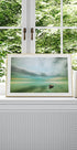Rauhallinen kohtaus, jossa yksinäinen vene kelluu hiljaa vedessä pilvisen taivaan alla. Tämä tyyni meriaihe herättää yksinäisyyttä, harmoniaa ja hiljaisia heijastuksia mykistettyjen vihreän ja sinisen sävyjen kanssa.