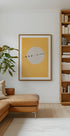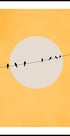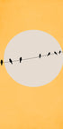 Minimalistinen ja tyylikäs kuvitus lintuista langalla, siluetoitu pyöreää taustaa vasten lämpimän keltaisen sävyin. Tämä moderni grafiikka säteilee rauhallisuutta ja tasapainoa ja siitä tulee rauhoittava, mutta samalla silmiinpistävä piirre modernissa sisustuksessa.