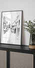 Vågn op i Portugal med en elegant rejseskitse af Awol Art Alex: en soloplyst portugisisk gade med caféborde, smalle facader og et diskret kirketårn i horisonten. Fine, minimalistiske linjer, lamper, vinduer og døre skaber dybde og perspektiv – en rolig morgenstemning fra Lisboa til Porto. Perfekt til elskere af portugisiske gader og rejsedrømme.
