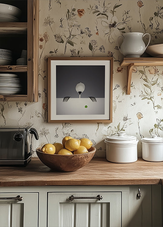 Wieteke de Kogelin leikkisä ja tyylikäs asetelmajuliste: kiiltävistä haarukoista ja lusikoista tulee pieniä, innokkaita käsiä, jotka kurkottavat yhtä vihreää hernettä pöydällä. Puhdas koostumus, mattametallinen kiilto ja vihreän pomppauspiste luovat huumoria, jännitystä ja modernistista charmia – täydellinen keittiöön, ruokailutilaan ja keskusteluihin.