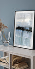 Et poetisk akvarel-landskab af Mareike Böhmer: tågede blå toner flyder sammen som hav og himmel, hvor lette skyer spejler sig i stille vand. Minimalistiske konturer og delikate overgange skaber ro og dybde, en nordisk-japandi stemning, der inviterer til fordybelse og stilfuld enkelhed. Abstrakte bølger antyder kyst og tåge.