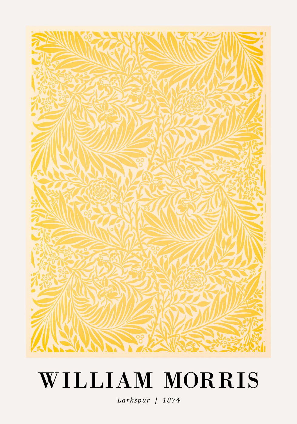 Ajaton kasviaiheinen juliste, jossa on William Morrisin Larkspur-kuvio vuodelta 1874. Tässä kauniisti yksityiskohtaisessa kukkakuosissa on elegantteja lehtiä ja kukkia klassisessa vintage-tyylissä. Täydellinen mihin tahansa luontoaiheiseen, vintage- tai jugendtyyliseen kotiin.