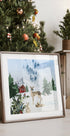 Step into a serene winter woodland where gentle deer and a curious rabbit pause amid frosted pines and distant mountains. Painted in soft watercolor tones by artist Emel Tunaboylu, this fairytale scene shimmers with snowflakes and festive calm—perfect for adding peaceful holiday magic to any space.