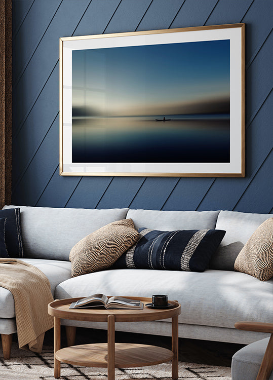 Rauhallinen vesimaisema, jossa yksinäinen soutaja liukuu hiljaisen veden yllä pehmeän taivaan alla värisävyissä. Maalauksellisella sumeudella ja minimalistisella sommittelulla teos herättää yksinäisyyden, rauhan ja henkisen tyyneyden tunteita vangiten eristyneisyyden hiljaisen kauneuden ja meditatiivisen rytmin olla yhtä luonnon kanssa.
