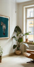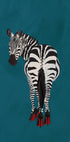 Tässä modernissa taideteoksessa on sinivihreää taustaa vasten seisova seepra, joka tunnetaan tyylikkäistä mustista korkokengistä. Surrealistinen sävellys sekoittaa villieläimiä muotiin ja luo rohkean ja leikkisän ilmeen, joka haastaa perinteisen eläintaiteen.